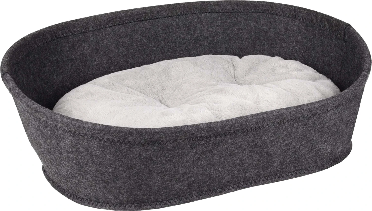 Panier ovale en feutre. Le coussin amovible est rempli de fibres de polyester et peut être lavé à 30°.