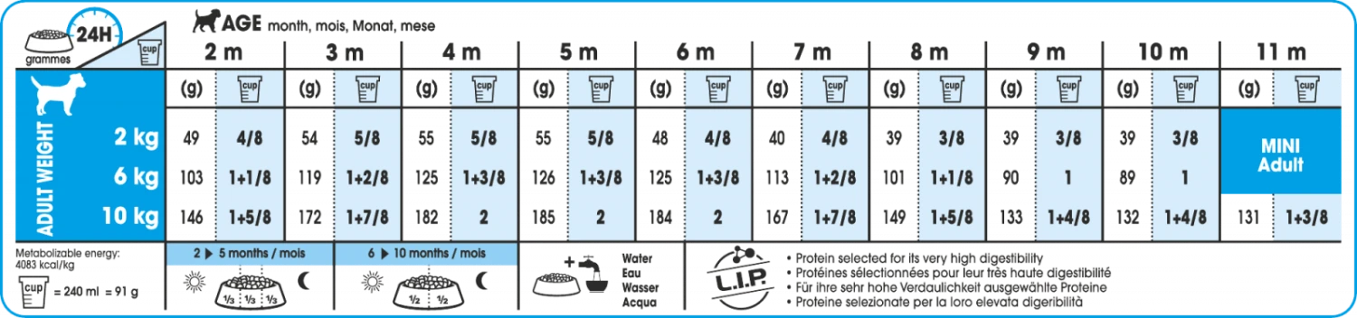 Pour chiots de petite race (poids adulte de 1kg à 10kg) de 2 mois à 10 mois. Disponible en 800g, 2kg, 4kg et 8kg.