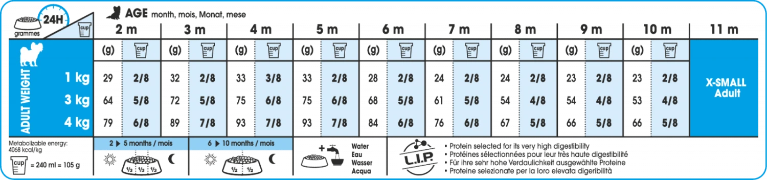 Répond aux besoins énergétiques élevés du chiot de très petite taille en phase de croissance et satisfait les appétits difficiles.
